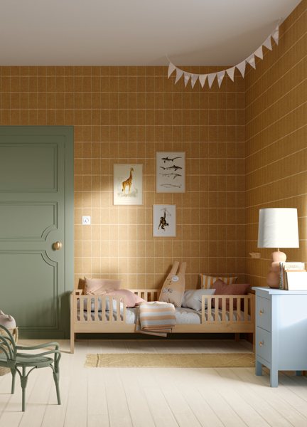 Le papier peint à carreaux jaune ocre sur les murs donne à cette chambre d'enfant un aspect ludique et rétro. La porte verte avec ses moulures et la commode bleu clair, peinte à la peinture à la chaux, créent un contraste de couleurs surprenant. Le blanc cassé du parquet et le gris clair du plafond rendent l'ensemble chaleureux et accueillant.