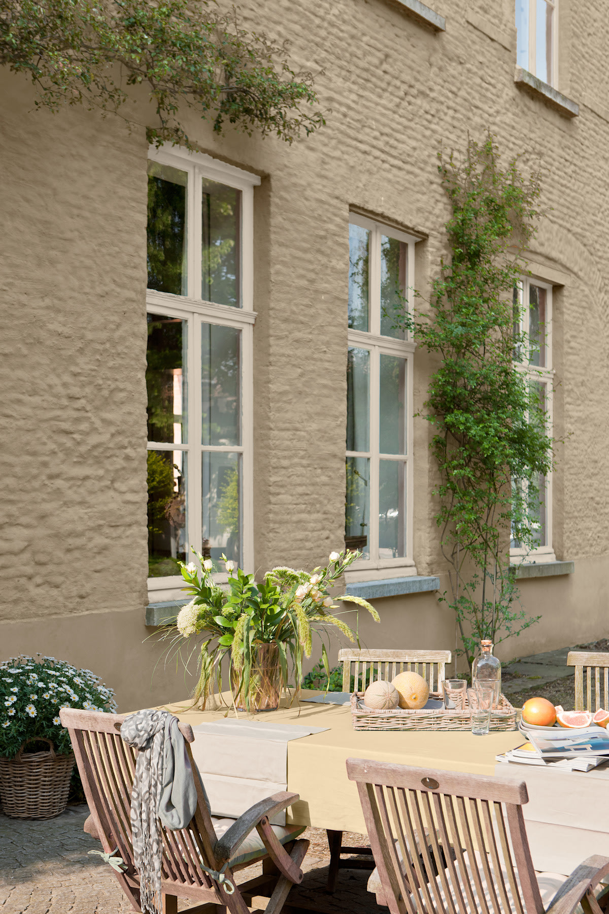 Door je gevel in een subtiele kleurtint te schilderen met een lichtere tint voor het schrijnwerk, krijg je een zacht en tijdloos geheel. Bovendien trekt de gevel meer open door een lichtere kleur op het schrijnwerk te plaatsen. In deze toon-op-tooncombinatie is in zowel de kleur van de gevel als dat van het schrijnwerk een subtiel groene ondertoon aanwezig. Daardoor zijn deze verfkleuren een ideale achtergrond voor het natuurlijke groen van de klimplanten op de gevel.