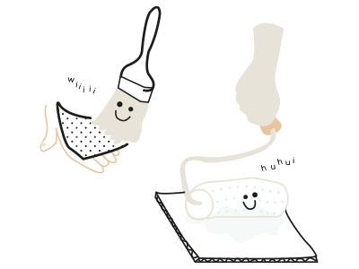 Maak een nieuwe verfrol goed nat en rol dan grondig uit over een stuk karton. Let wel: voor het schilderen met solventgedragen verf gebruik je altijd een droge verfrol. Verwijder eventuele pluisjes door de rol te omwikkelen met een plakband.