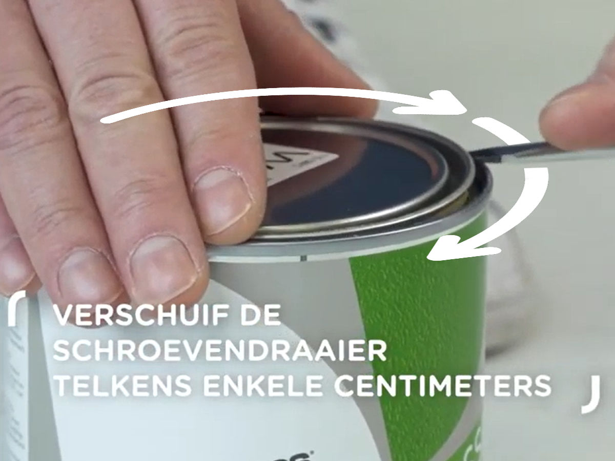 • Draai het blik gerust mee wanneer je je schroevendraaier telkens enkele centimeters verder plaatst onder het deksel.